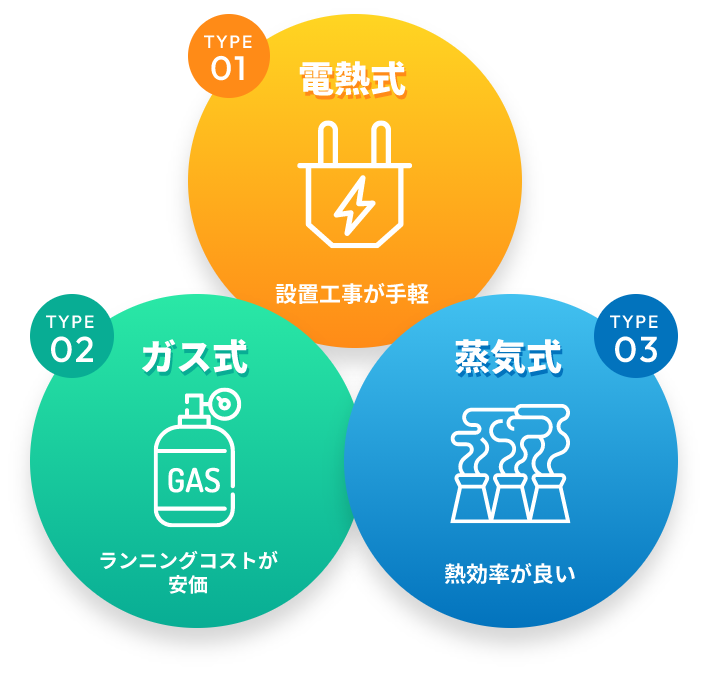電熱式・ガス式・蒸気式それぞれのメリットは何ですか?